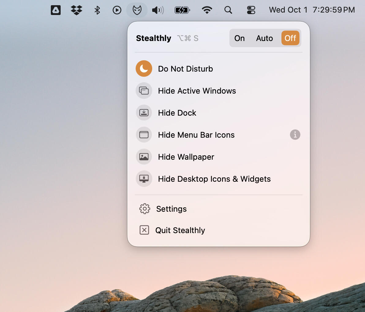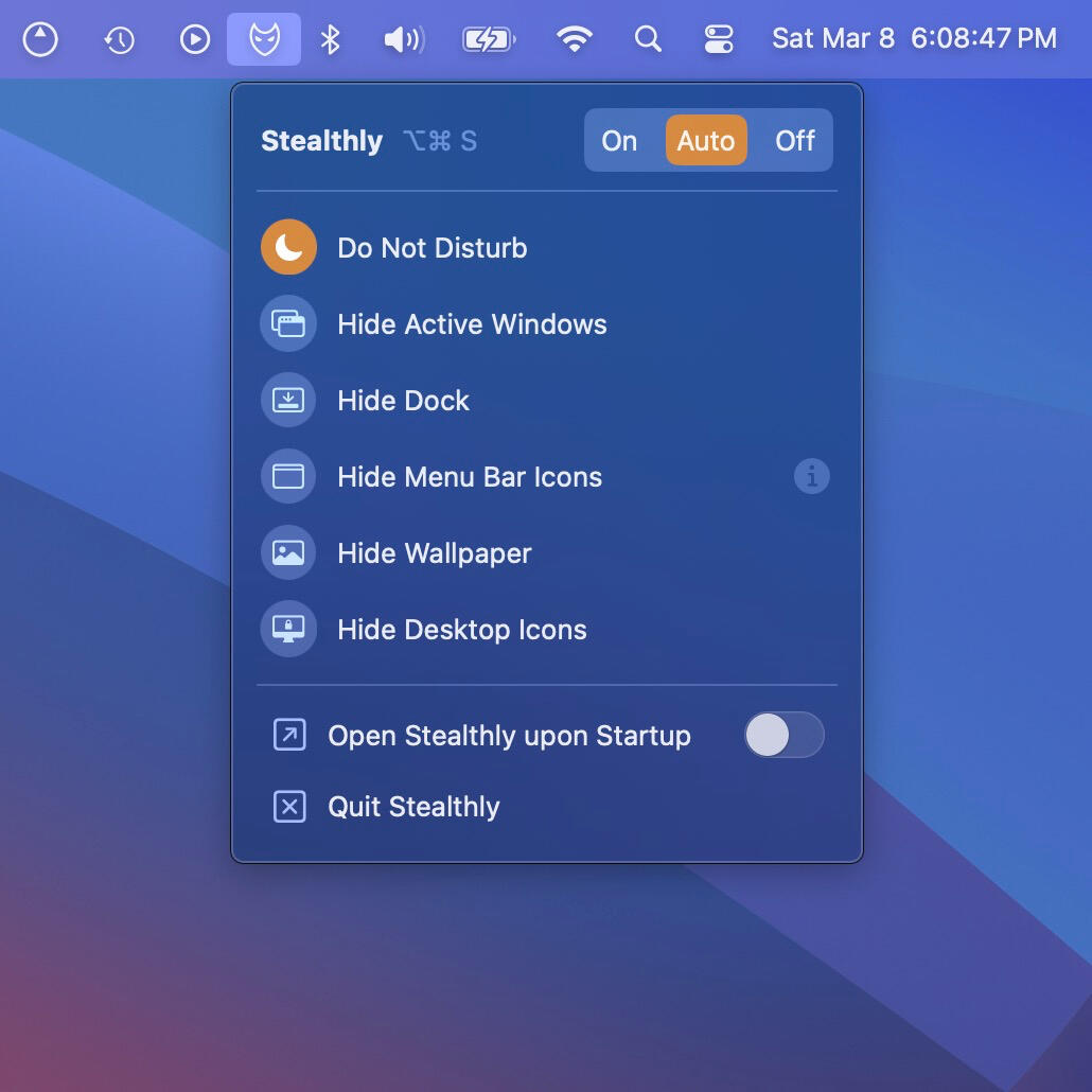 Stealthly can hide desktop icons, wallpaper, the dock, menu bar icons, and active app windows. It can also enable Do Not Disturb to keep notifications from appearing while you share or record your screen.