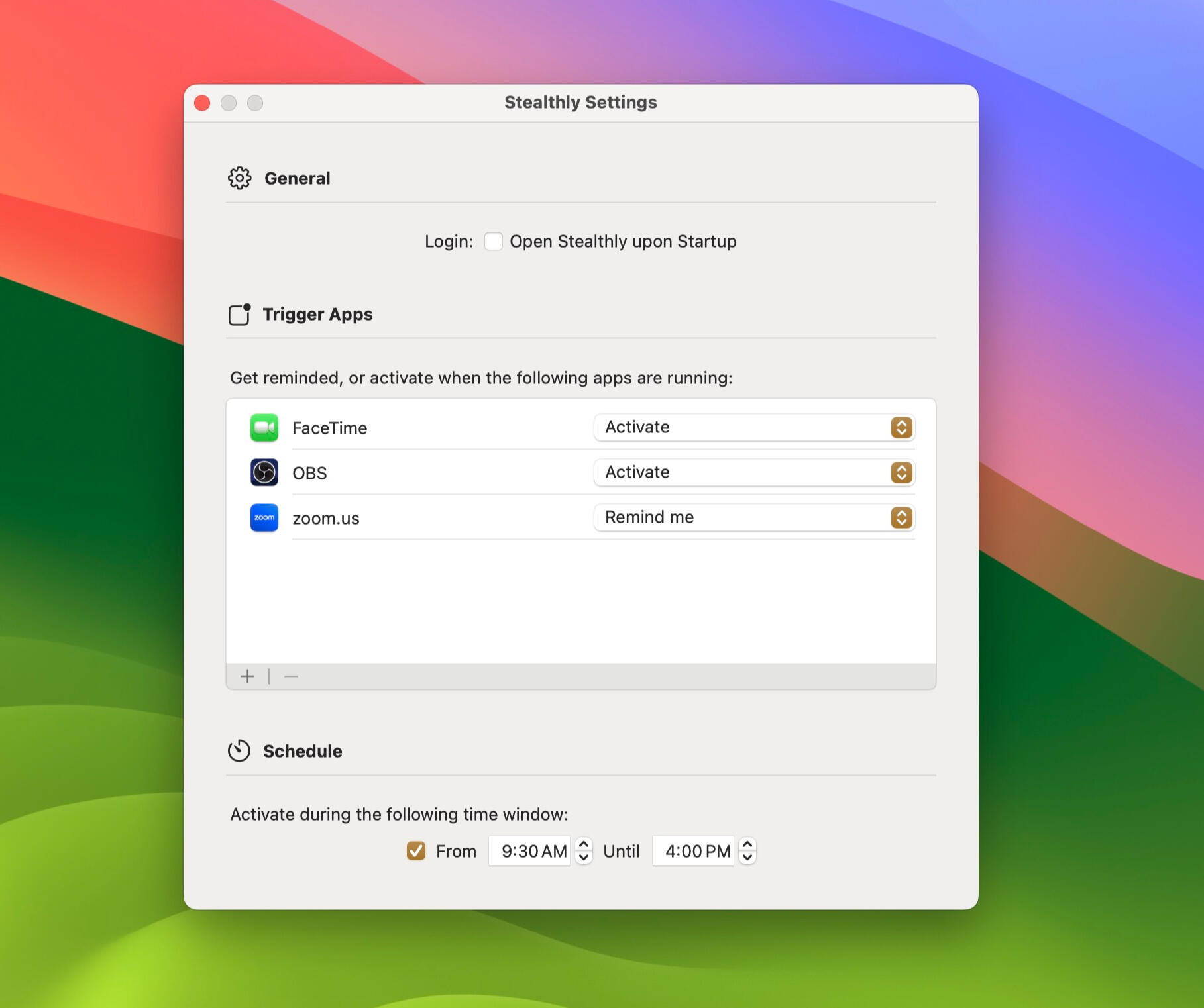 Use automatic screen sharing and screen recording detection, trigger Stealthly when certain apps are running, or set a schedule that fits your workflow.